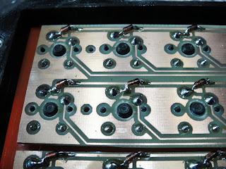 I used six of these PCB slices for the buttons, the last two rows are a little bit different, due to the different size of the key caps, though electrically the same.